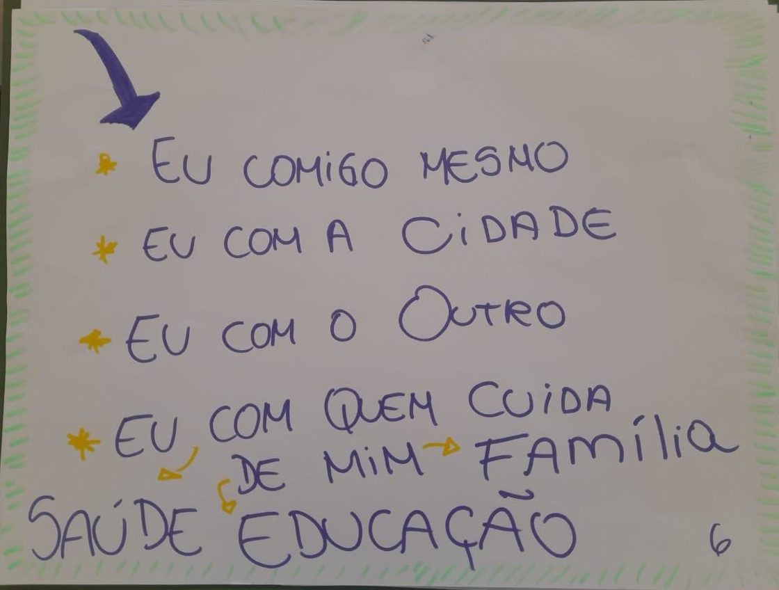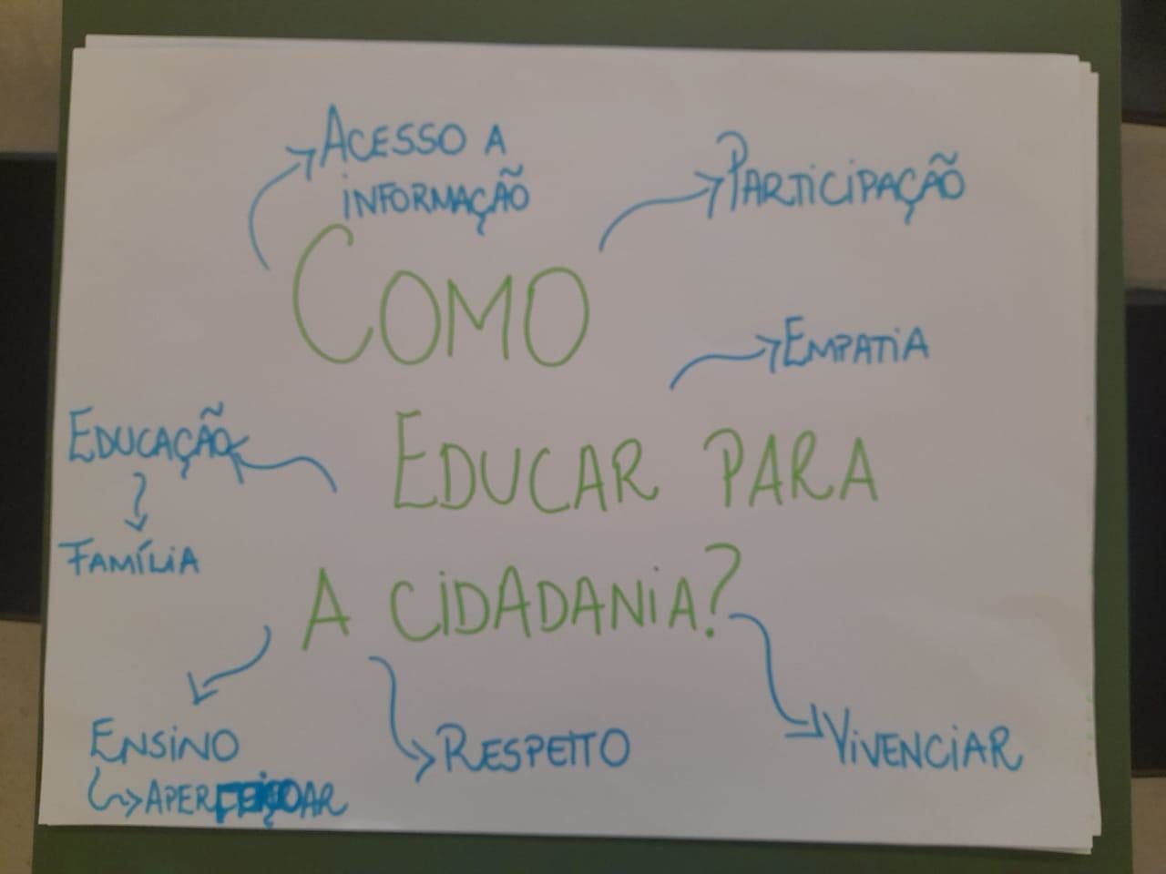 O mesmo grupo escreveu que a educação para cidadania seria: “fomentar, por meio da educação informal (família, comunidade…), formal (escola) e não formal (organizações comunitárias, educação em saúde) reflexão coletiva (virtual e presencial) que articule propostas de melhoria para a qualidade de vida na cidade a partir dos anseios e necessidades da população”.