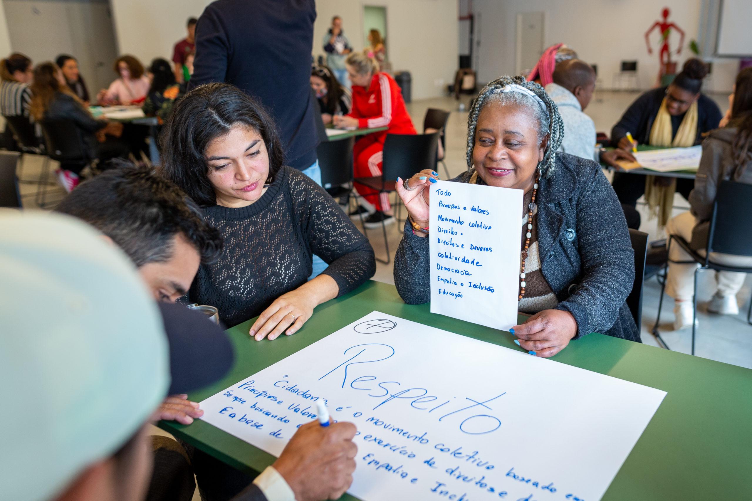 Depois da grande roda, o pessoal foi dividido em sete grupos. Em um word cafe, os grupos debateram primeiro o que é cidadania e depois como educar para a cidadania.